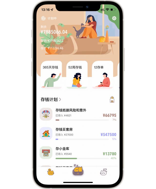 高兴之余,他反思了自己没有存款的生活现状。“瞬间压力感觉大了。以前花钱大手大脚,现在要为即将到来的宝宝做打算。”于是,他又着手开发了一款存钱 app,取名懒猫存钱,在当年 7 月上线。