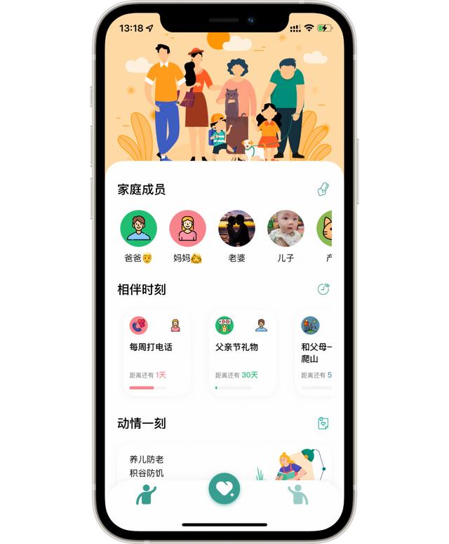 他说,自己很受周杰伦《外婆》里的一句歌词打动,即“她要的是陪伴,而不是六百块。”他想通过这样一款工具,时不时提醒自己陪伴的重要性——这在 APP 里被具体落实为“陪父母看一场电影”、“记住父母的生日”、“陪父母做体检”等条目,配合他自己绘制的插画、图标,“就有了现在的 HomeTime。”