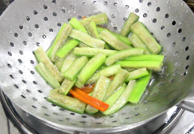 4.锅内烧水,水里加入植物油,水开后倒入丝瓜条,焯水30秒后倒出,水里加点植物油的目的,是焯过水的菜色泽发亮。