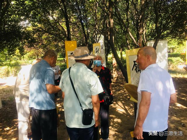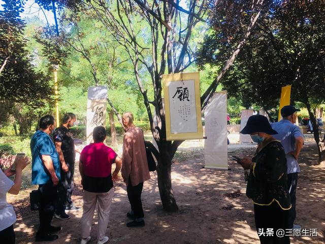 李东辉老校长的同事走进展区,学读愿字书幡文字。