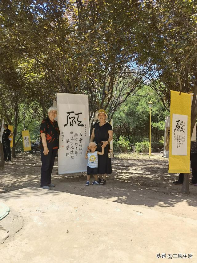 郑飞老邻居带孩子走进展区,请老校长教孩子们读诵愿字书幡文字。