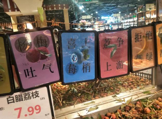 网友“相忘于江湖”逛超市时发现,水果区域有一系列谐音宣传,如“杨梅吐气” “喜上莓梢” “荔争上游” “拒绝蕉绿” “檬的都对” “奇开得胜”……