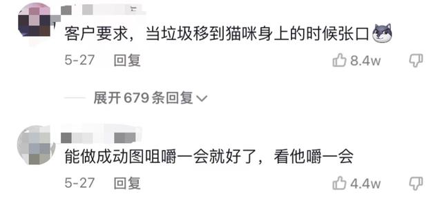 底下网友还给出改进的建议,让垃圾移到猫猫身上时再让它张嘴,或者做成动图咀嚼一会,或许会更意思。