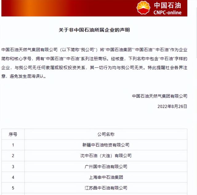 8月26日,中国石油天然气集团有限公司(以下简称“中国石油”)发布声明称,其将“中国石油集团”“中国石油”“中石油”作为企业简称和核心字号,拥有“中国石油”“中石油”系列注册商标。经核查,新疆中石油物资有限公司等136家企业名称中包含“中石油”字样的企业。