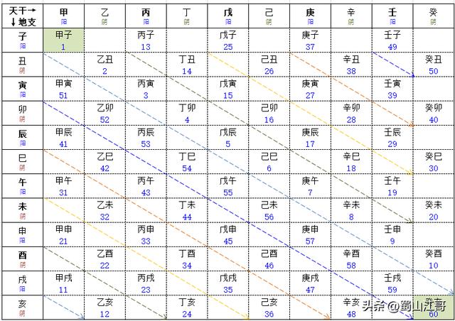 “六十甲子”是由十天干与十二地支顺序组合而来,起于十天干首字“甲”、十二地支首字“子”,止于十天干尾字“癸”、十二地支尾字“亥”,依次轮流共60个组合,故称为“六十甲子”。每一天干被组合六次,每一地支被组合五次,如:甲子、甲寅、甲辰、甲午、甲申、甲戌……乙丑、丁丑、己丑、辛丑、癸丑……这里给大家分享一个记忆“六十甲子”的小技巧:甲子序号1、11、21、31、41、51天干为甲,以此类推10、20、30、40、50、60天干为癸;甲子序号1、13、25、37、49所对应的地支为子,序号间隔差刚好为十二,以此类推12、24、36、48、60地支为亥。