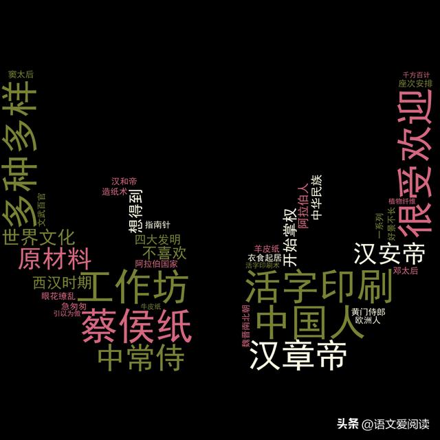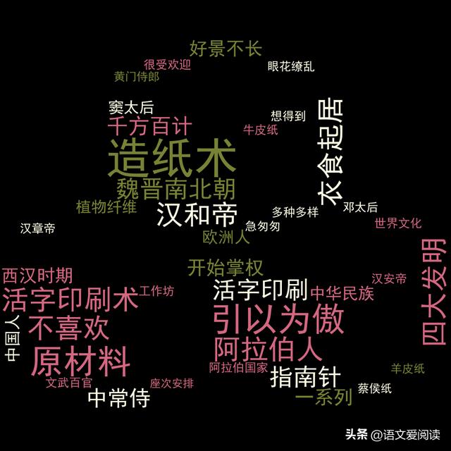 有了蔡伦的造纸术,古代百姓的生活方便了很多,在纸张还没有被发明出来的时候,人们都在竹简(zhú jiǎn)上写字,往往写完了一卷竹简(zhú jiǎn),一篇文章都还没写完,而且竹简搬运(bān yùn)起来也很麻烦(má fan)。早期的纸张虽然(suī rán)让人们从笨重的竹简中解放出来,可当时的技术并不先进,制作出来的纸经常会出现渗墨、破裂(pò liè)的情况,直到蔡伦发明了植物纤维(zhí wù xiān wéi*)纸以后,人们的写作才真正开始便利(biàn lì*)起来。蔡伦的造纸术和指南针(zhǐ nán zhēn*)、活字印刷术(huó zì yìn shuā shù*)、火药并称(bìng chēng*)为古代四大发明(sì dà fā míng*),它们是中华民族(zhōng huá mín zú*)引以为傲(yǐn yǐ wéi ào*)的宝藏(bǎo zàng*),为世界文化(shì jiè wén huà)的发展和传播做出了重要贡献(gòng xiàn)。