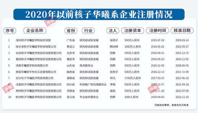 从2015年第一家深圳核子华曦医学检验实验室开始,4年间共注册10家“核子华曦”系医学检测公司,分布在广东、黑龙江、河南、山东等10个省份。