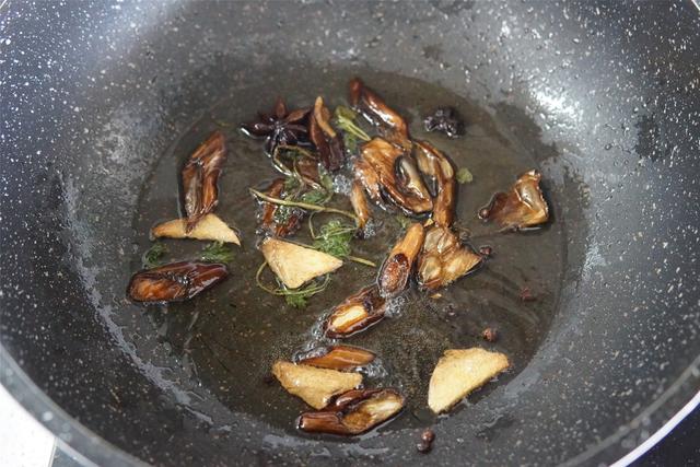 2、炒锅中加入适量油,冷油加入花椒、姜片、葱段、香菜、香叶、八角,开小火慢煎至食材焦黄,残渣丢弃,料油备用。