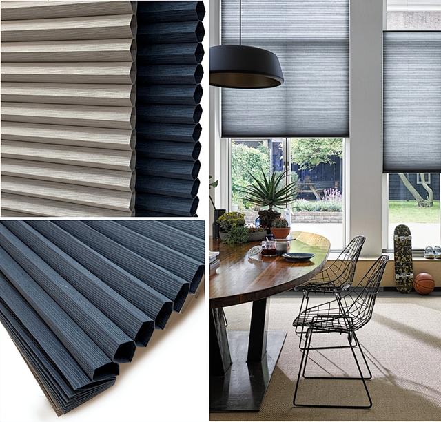 蜂巢帘远看乍一看和普通百叶无异,但是仔细近看,中空设计,形似蜂巢,隔热保温。这种窗帘也叫蜂窝帘,风琴帘。