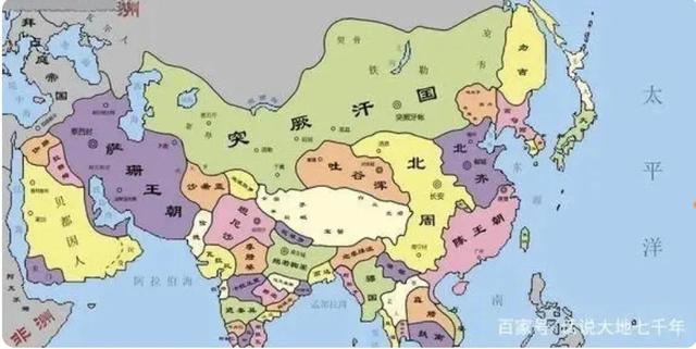 567年,突厥与波斯萨珊王朝联手灭掉了嚈哒帝国(起源于阿尔泰山,原臣服于柔然,史称白匈奴),以阿姆河为界,以北属于突厥汗国,以南的吐火罗地区(阿富汗)属于波斯萨珊王朝。