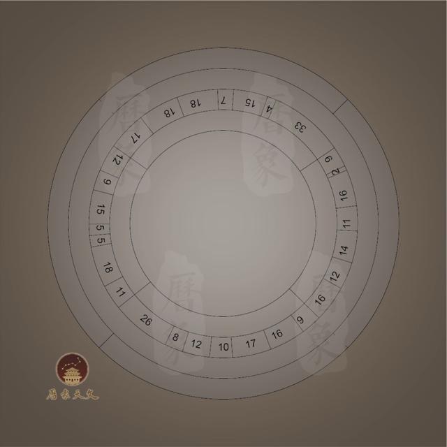 此环是由十二地支系统(12个全显)和十天干系统(只有8个,缺位戊己)和后天八卦系统(只显示乾坤艮巽,四隅位的四卦)交错组成。风水上称这24个点为二十四山,用于空间定位,24等分圆周。用于罗盘的话,这个圆周是360度。在五运六气体系里,圆周是365.25度。
