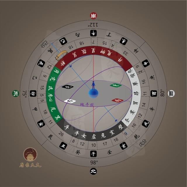 2)这是我们熟知的四象区域,东方青龙,南方朱雀,西方白虎,北方玄武,这四象并非均分这个圆周。我们的二十八星宿所占的度数都是实测,充满了差异化,不是理论上的等分划分,体现人道要合于天道,而非要让天道顺应人道。从体量上来看,朱雀体量最大,占了112度,东方青龙最小,占了75度。西方白虎占了98度,北方玄武占了98度,就这样四分周天,合计365度,一个回归年365.25度,我们知道五运六气里周天度数也是365.25度,此图圆周缺少的0.25度可能是在绘图时略去了,没有精确到小数点后一位的缘故。