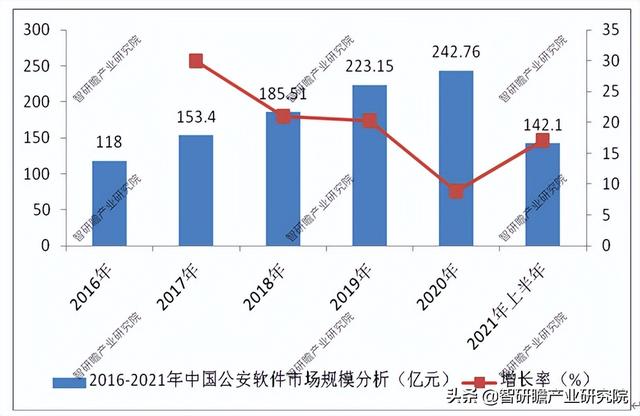 中国公安软件市场规模从2016年的118.00亿元增长至2020年的242.76 亿元,同比增长8.79%。2016-2021年公中国安软件市场规模分析如下: