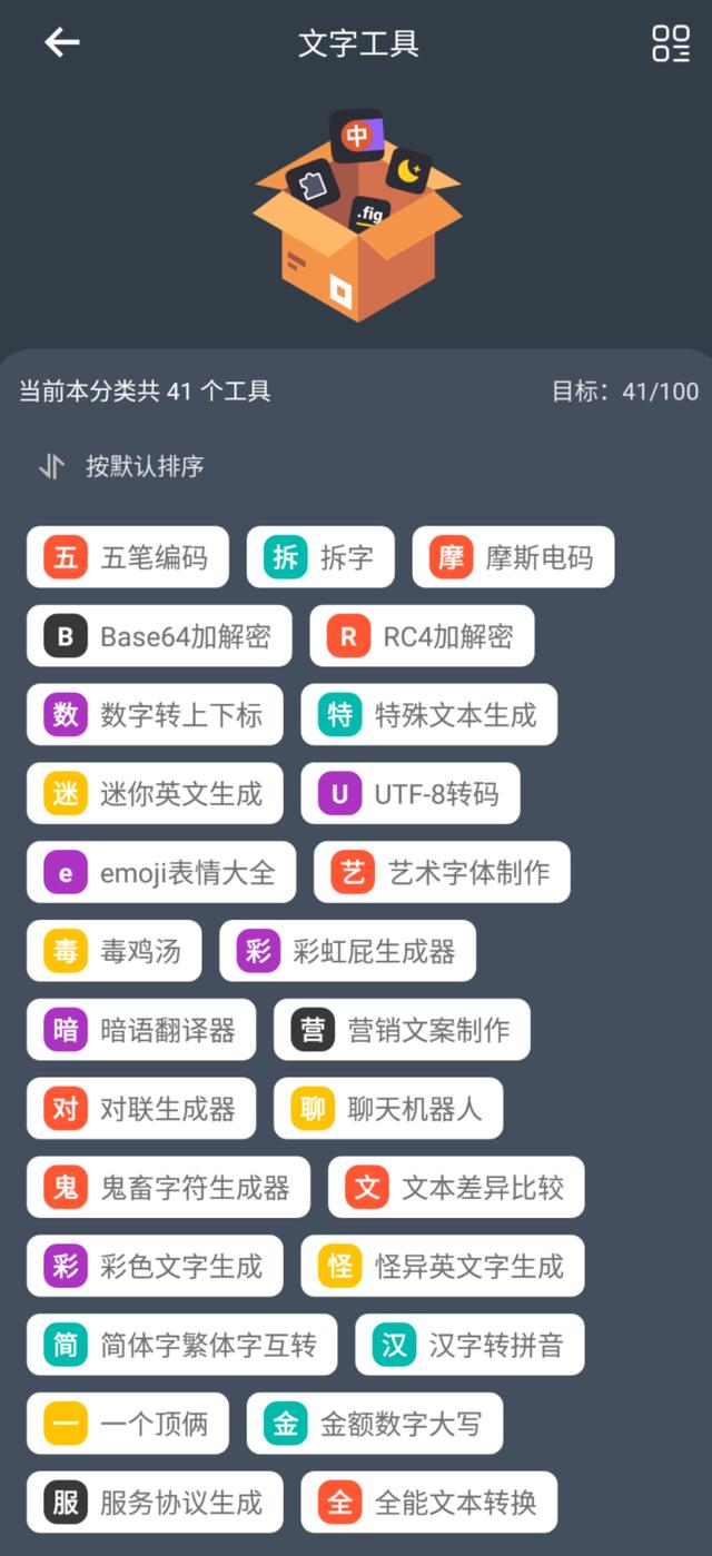 目前神奇工具箱的目标已经完成35%了,可以看到各类工具的进度,十个大类:日常、系统、图片、查询、提取、开发、文字、计算、趣味游戏、其他。只有图片工具最接近目标,已经有91款。在界面上的那句随机格言倒是挺应景的:人的痛苦会把自己折磨到多深呢?