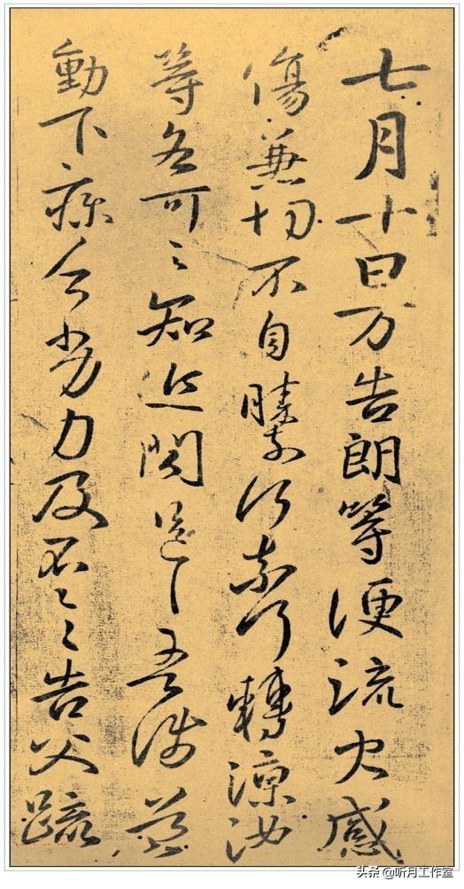 谢安的《中郎帖》,清代收藏鉴赏的大家顾复在《平生壮观》里载,《八月五日帖》“计六十五字”“四角古图书,写于白纸上,字大如钱”。既具有“神逸秀媚”东晋时代的书风特色,又有谢安自己雄健独特的书法个性。《中郎帖》又称《八月五日帖》,相传是谢安写的一封报丧书信,信中告知中郎突然去世的消息,同时表达了自己内心痛苦不堪,难以忍受的情感。