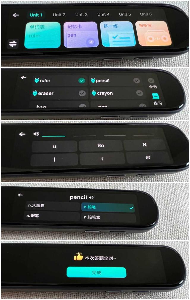 然后,可以直接在翻译笔上进行拼写测试,之后还能进行听写练习,从而形成“看-测-练”三步循环记忆法,这种记忆方法也是特别针对高年级学龄段学生记忆单词的痛点而设置的,因为他们要记的单词很多,经常背了后面忘了前面,而“看-测-练”的三步记忆,特别是对单词词根构成的练习,有助于他们加深对单词的认知,从而大大减轻高年级学生记忆单词的负担。这可以说是在学习方法上做到了适龄和同步。